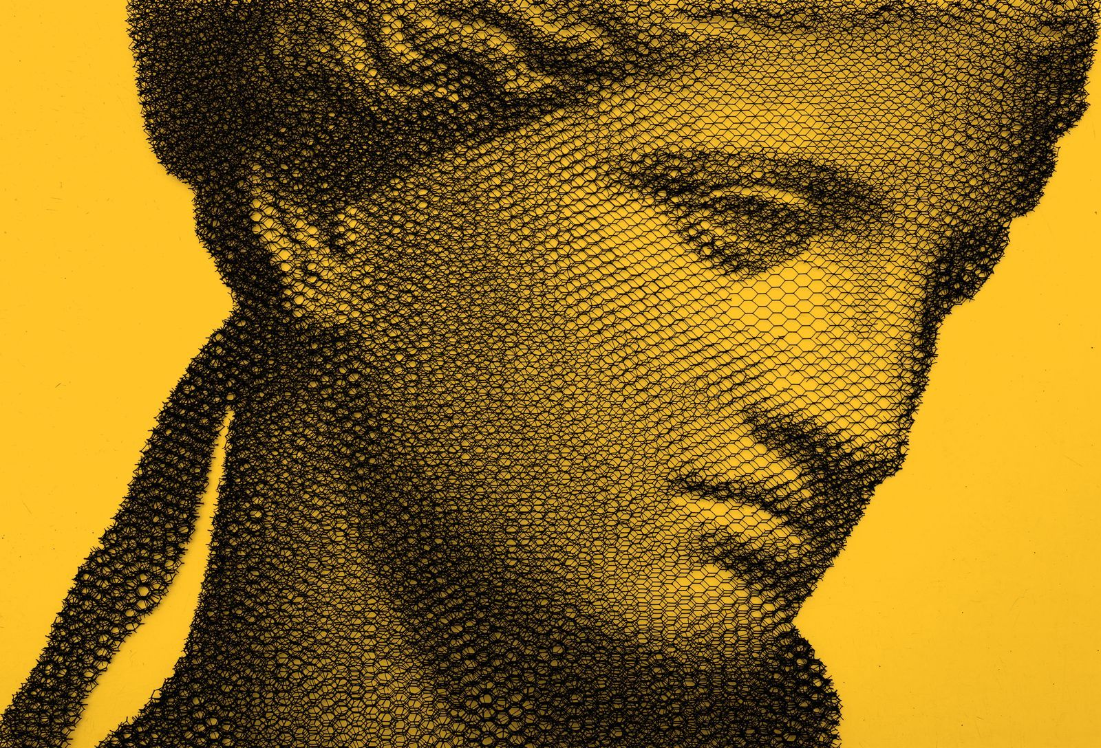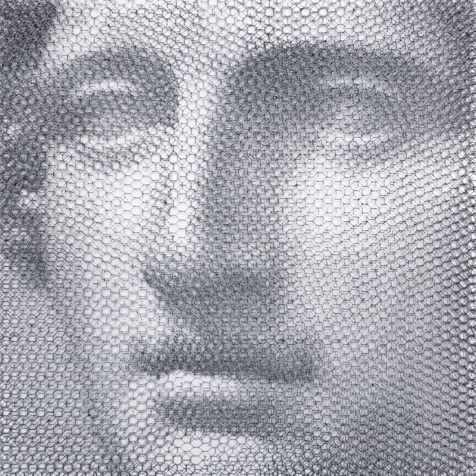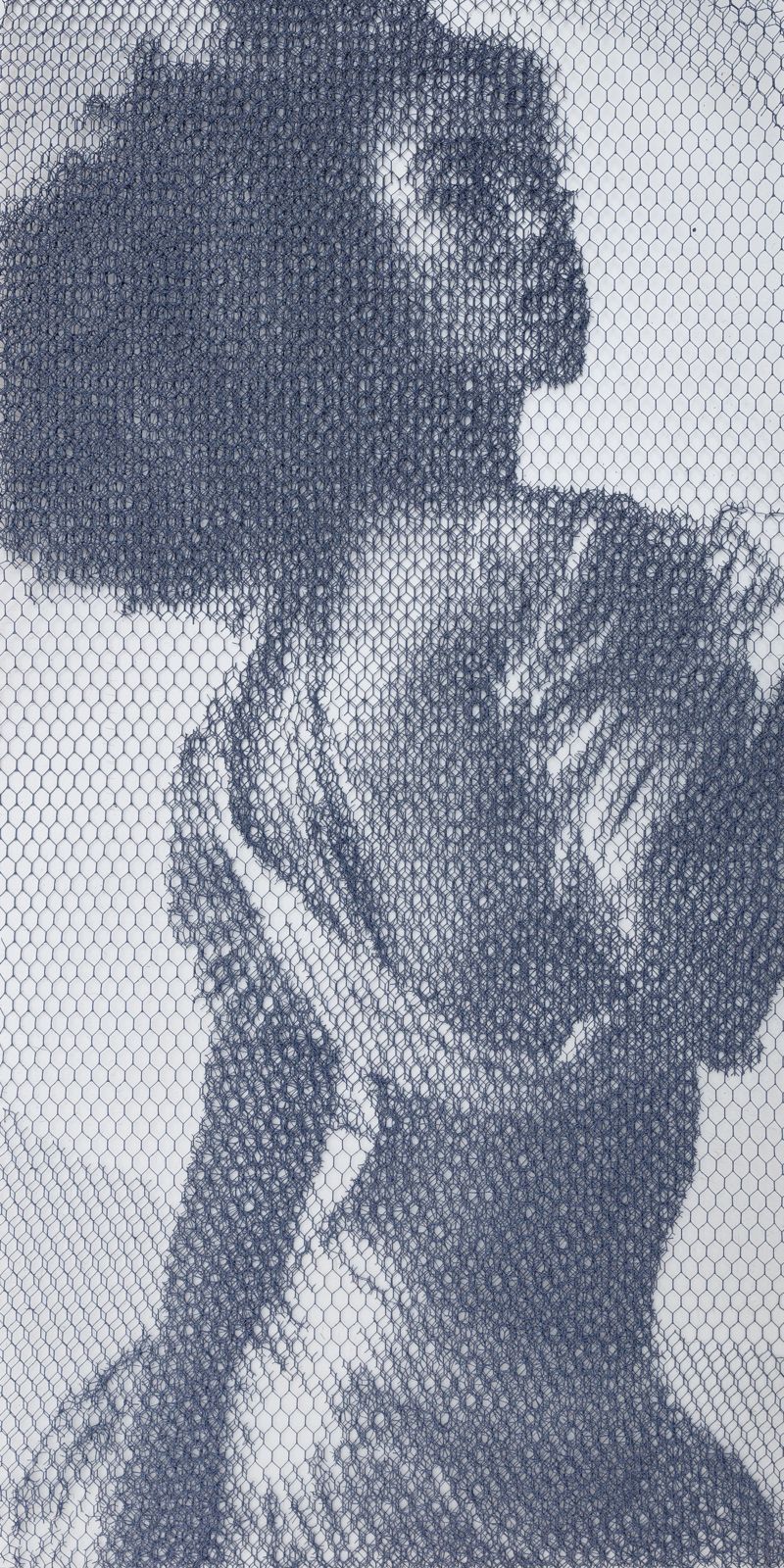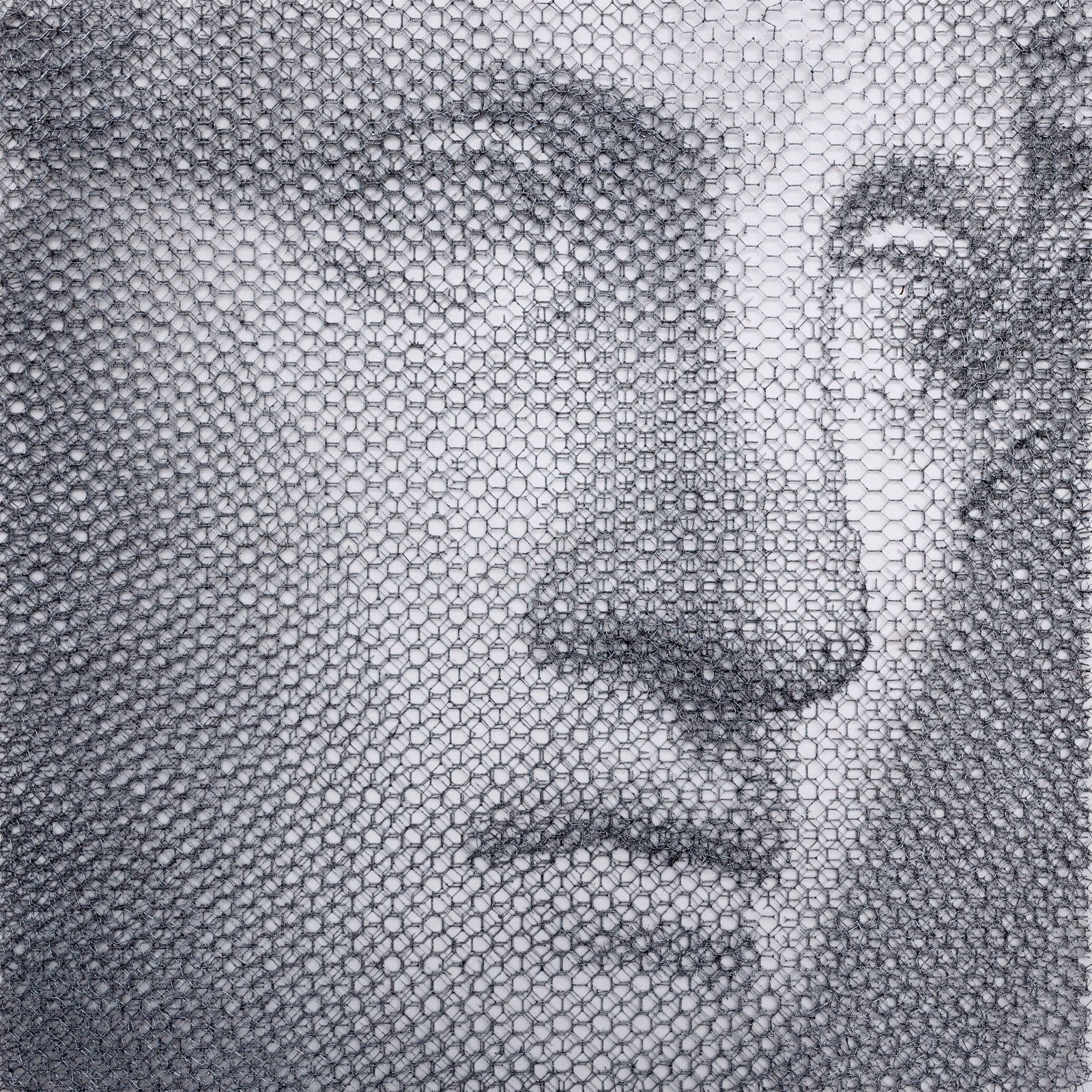 Without any drawing on the monochrome backdrop, from the studied superimposition of 10 layers of wire mesh, patiently cut by hand in studied locations, appear the chiaroscuro gradations that make up the images of young women’s faces, mannequins, details of classical statuary, or even interiors of buildings and urban views.