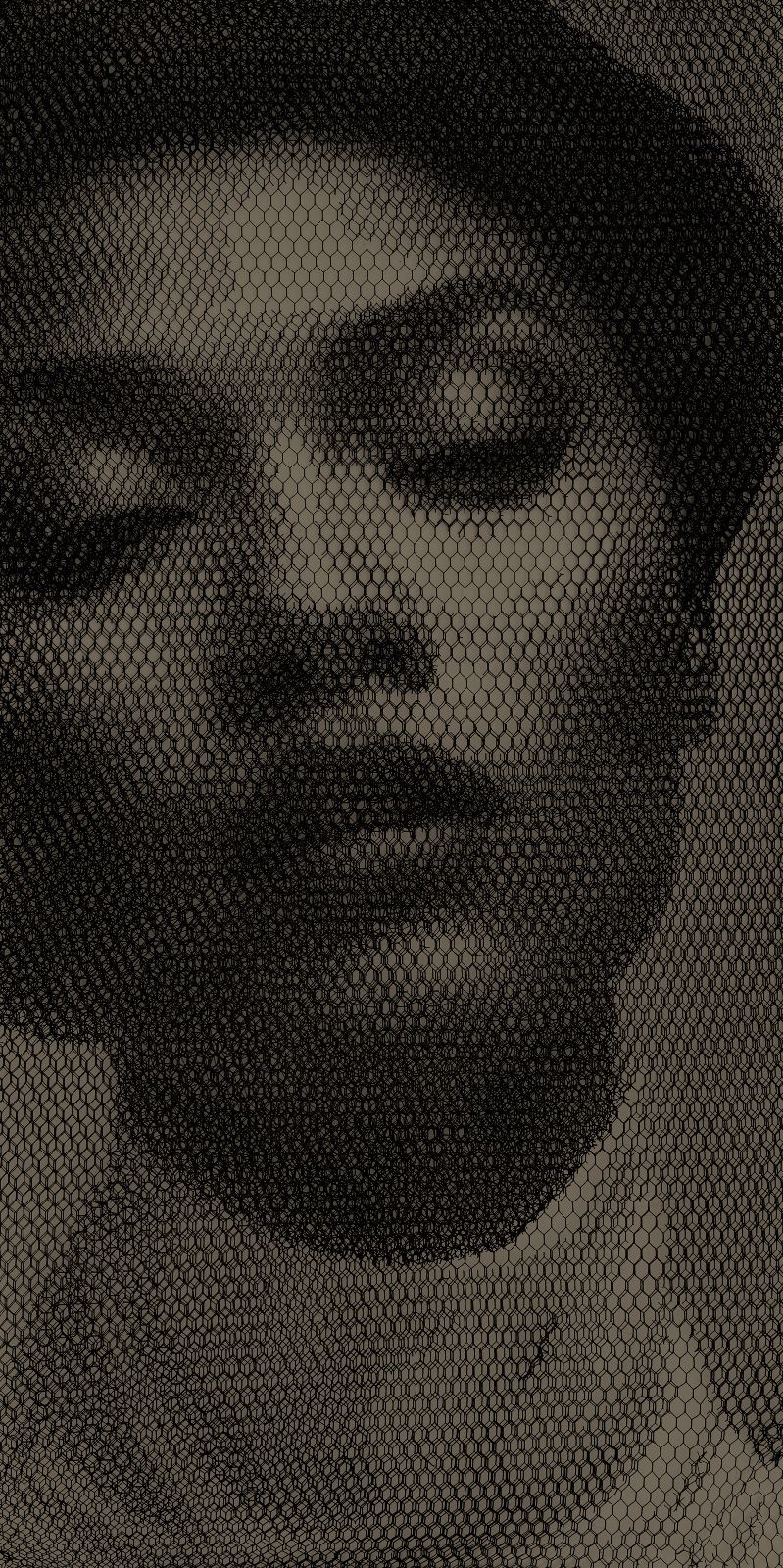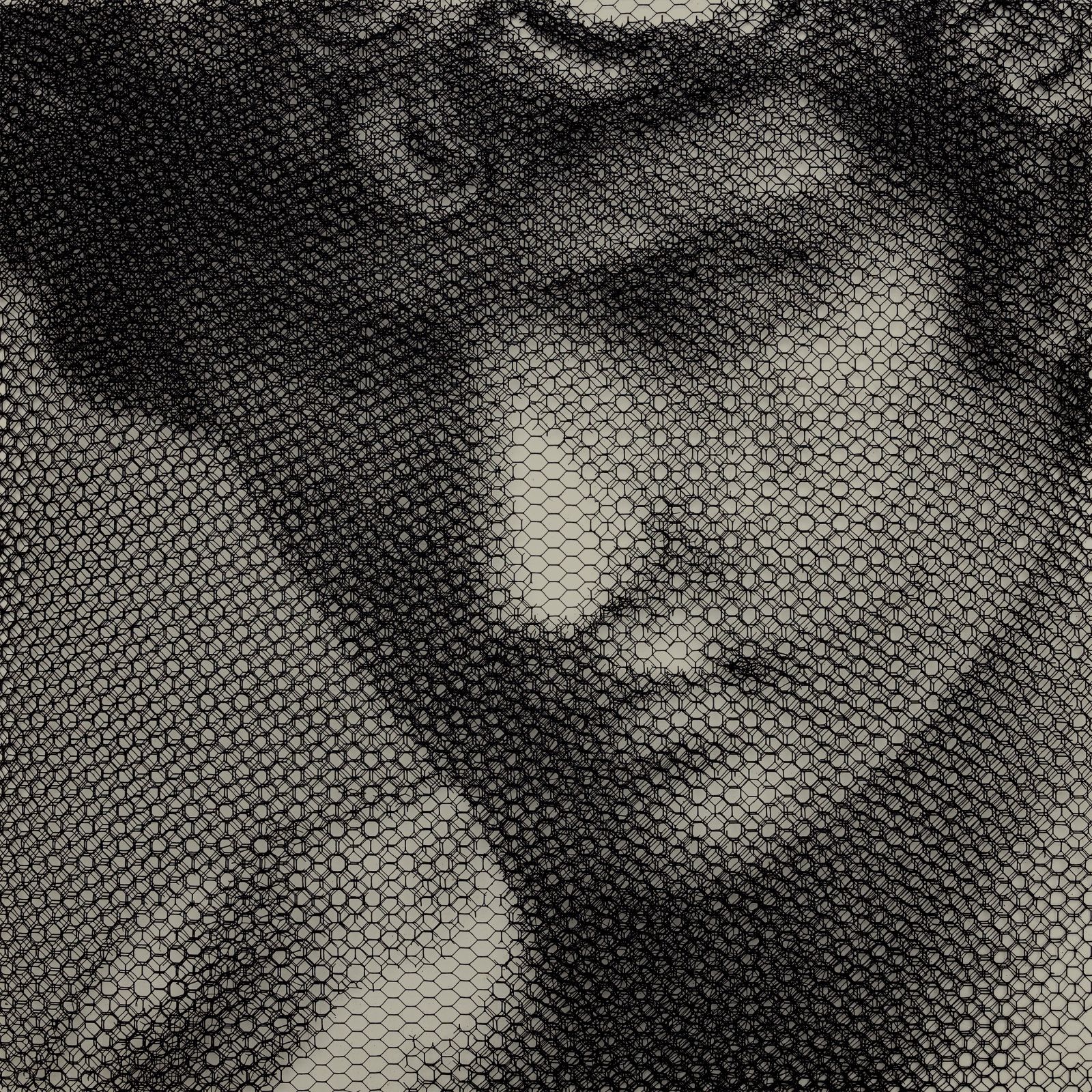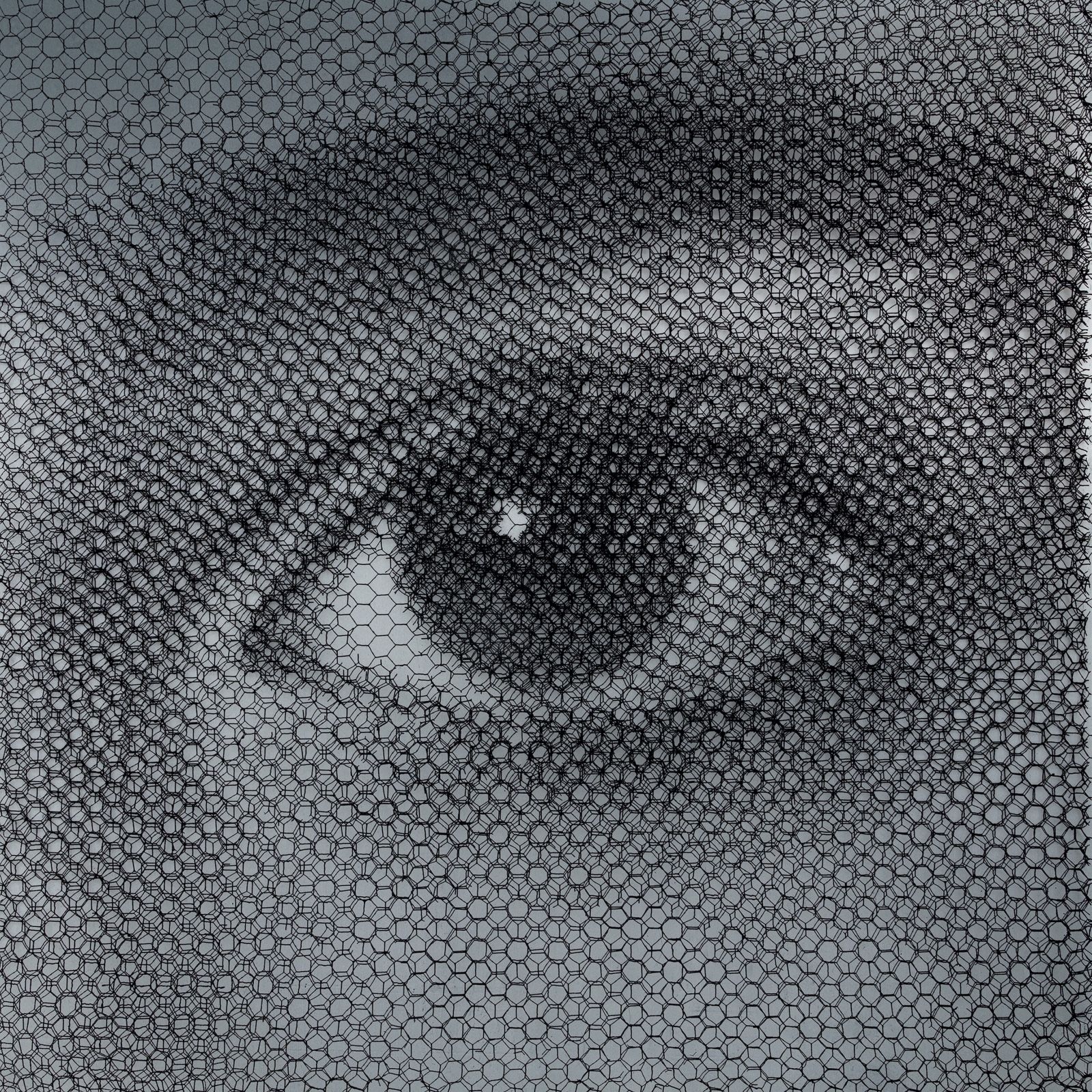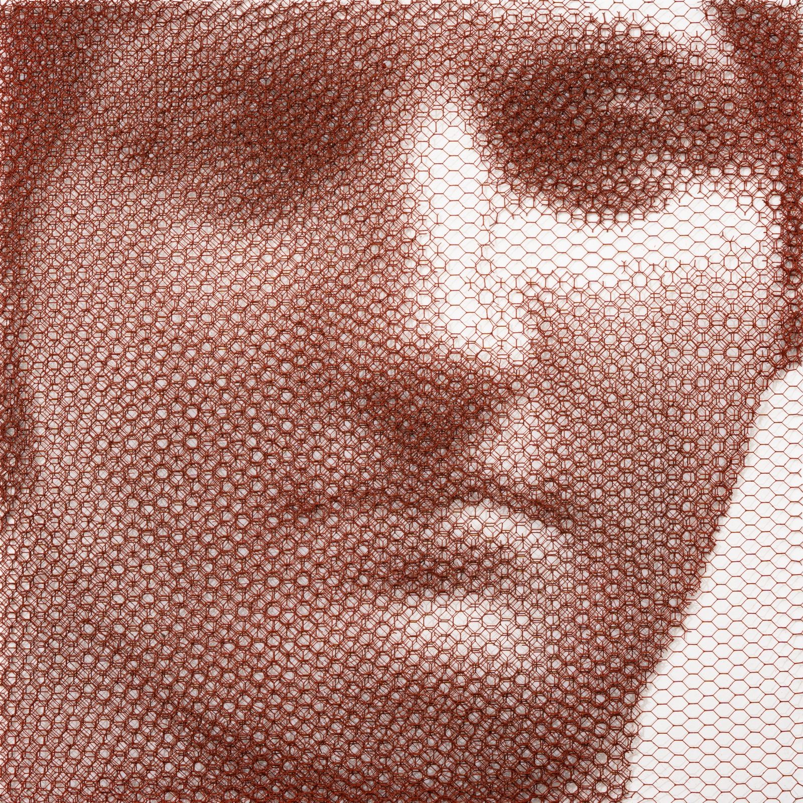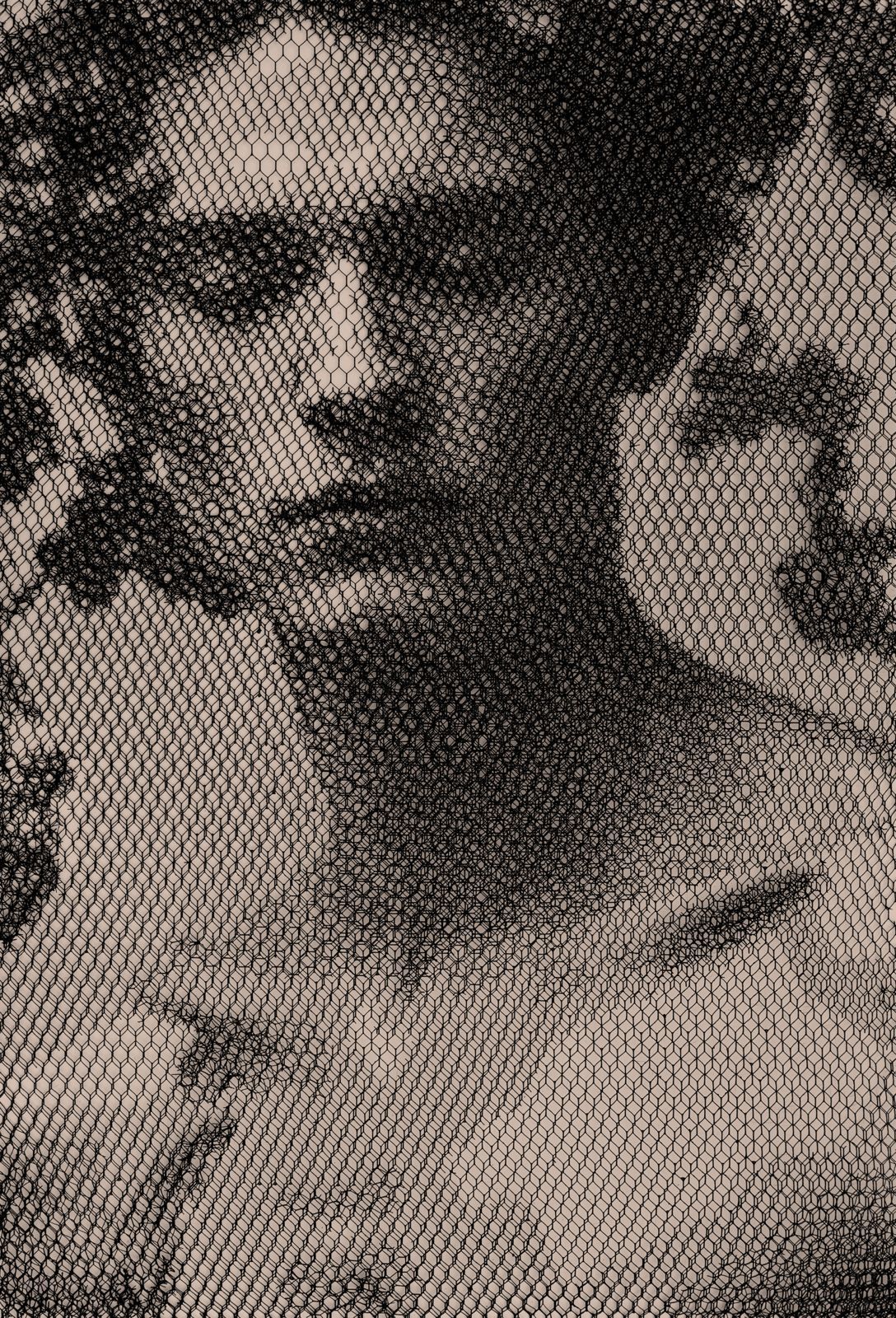 Without any drawing on the monochrome backdrop, from the studied superimposition of 10 layers of wire mesh, patiently cut by hand in studied locations, appear the chiaroscuro gradations that make up the images of young women’s faces, mannequins, details of classical statuary, or even interiors of buildings and urban views.
