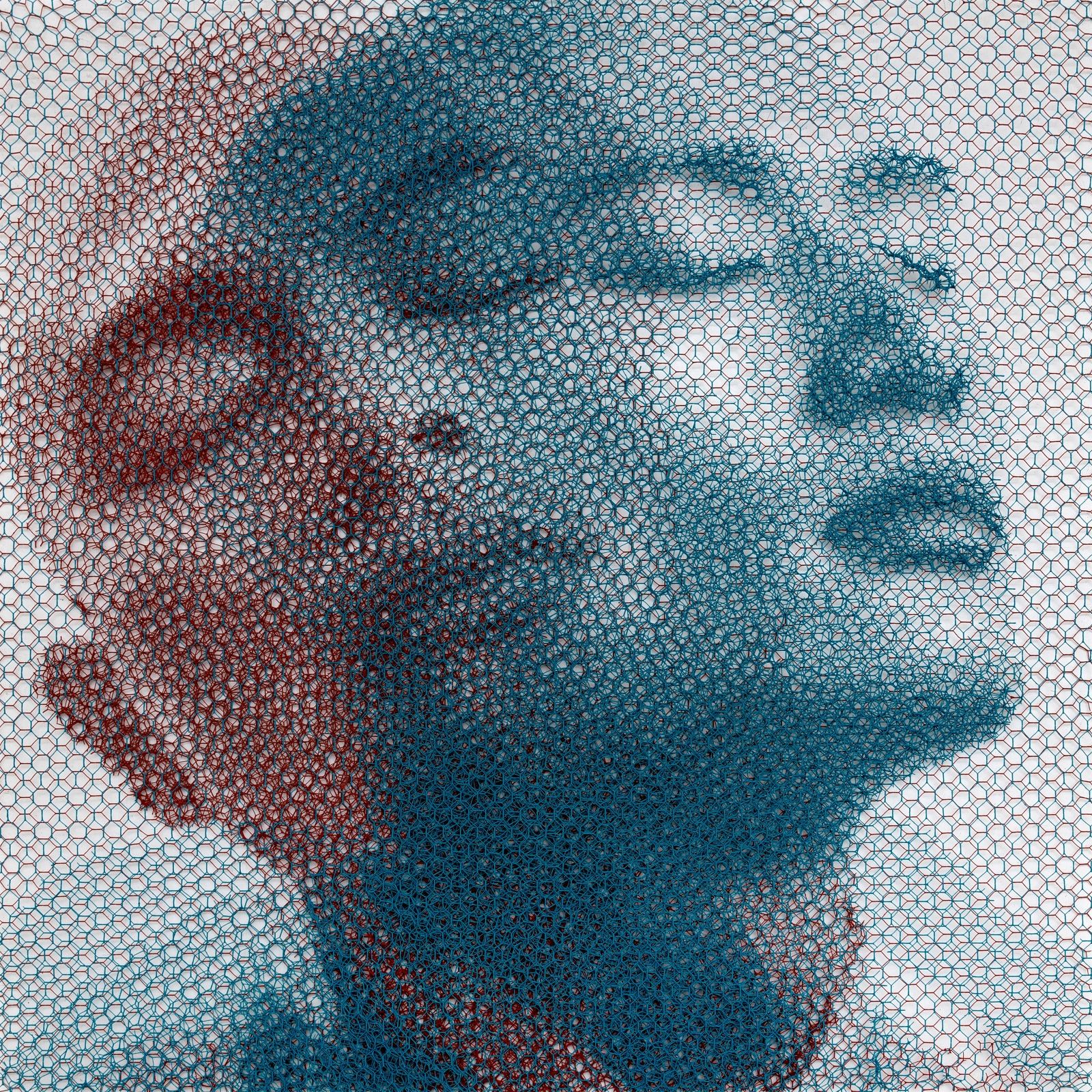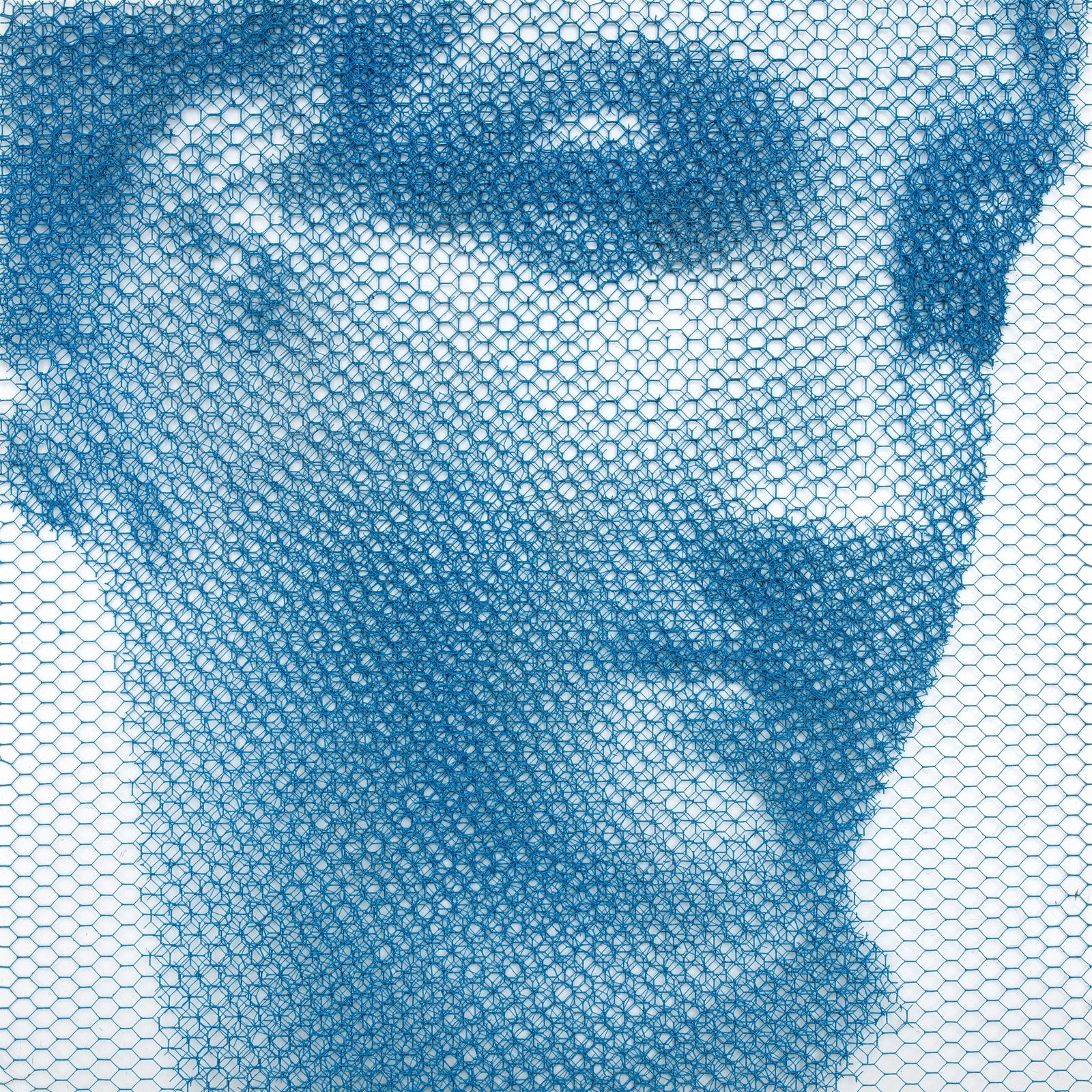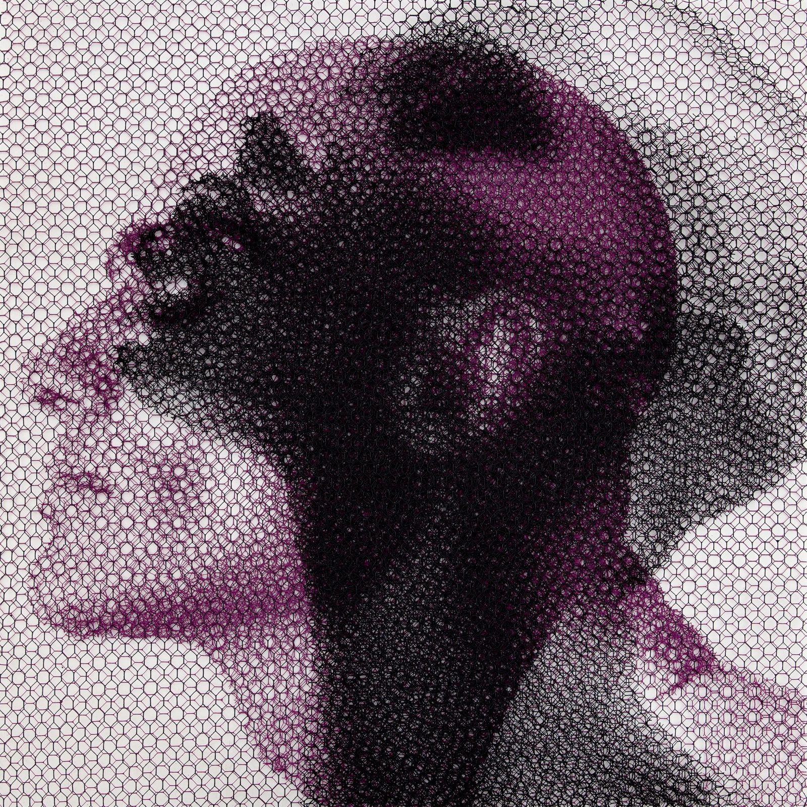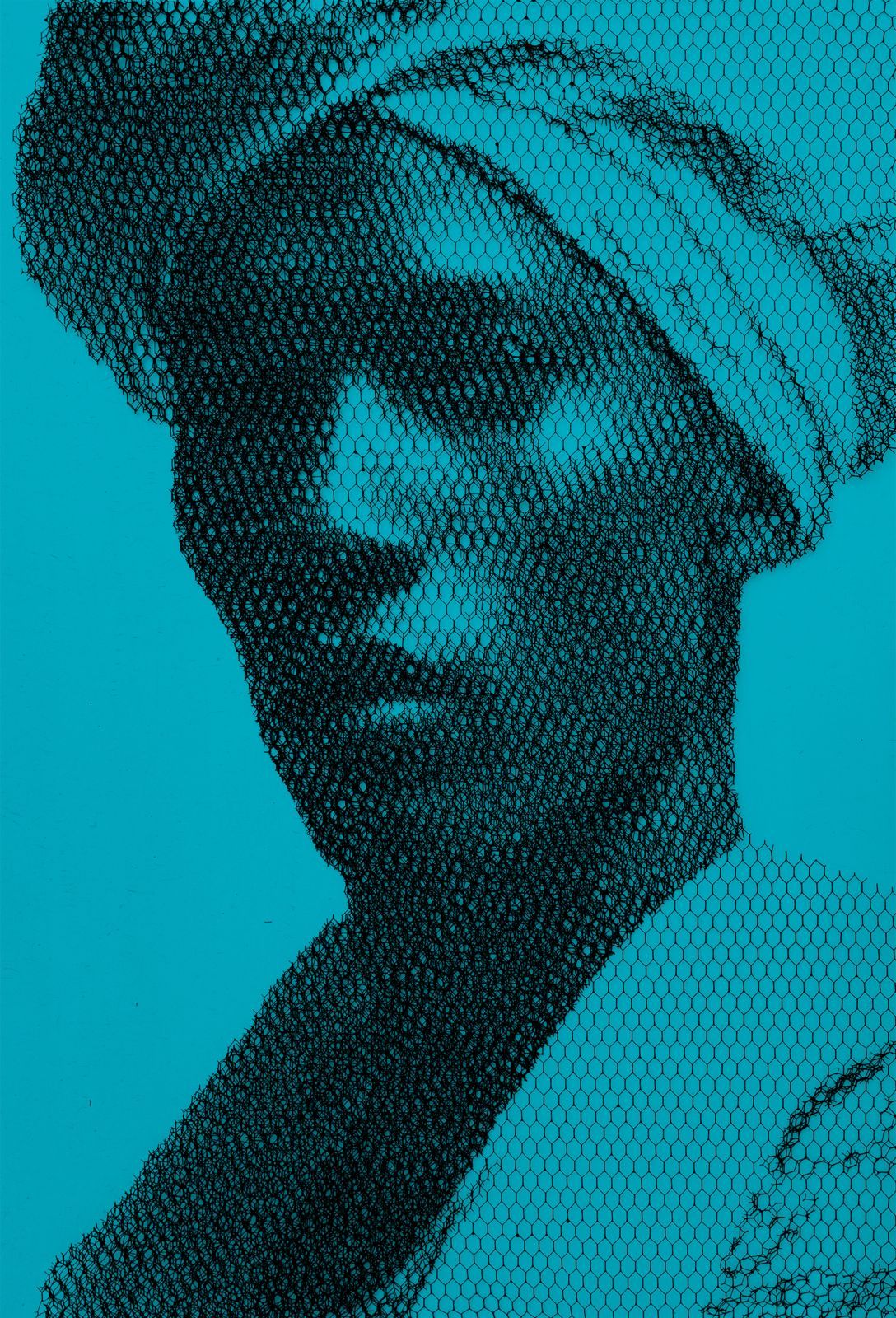 Without any drawing on the monochrome backdrop, from the studied superimposition of 10 layers of wire mesh, patiently cut by hand in studied locations, appear the chiaroscuro gradations that make up the images of young women’s faces, mannequins, details of classical statuary, or even interiors of buildings and urban views.