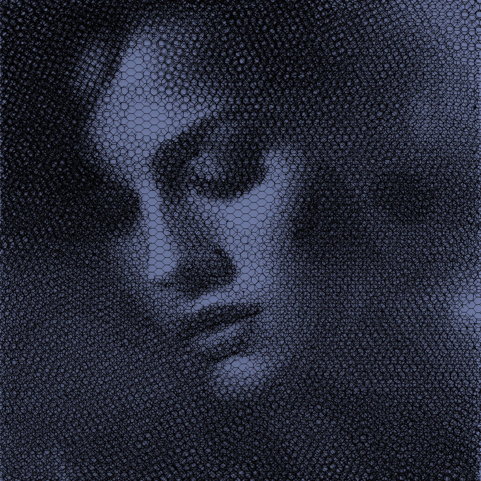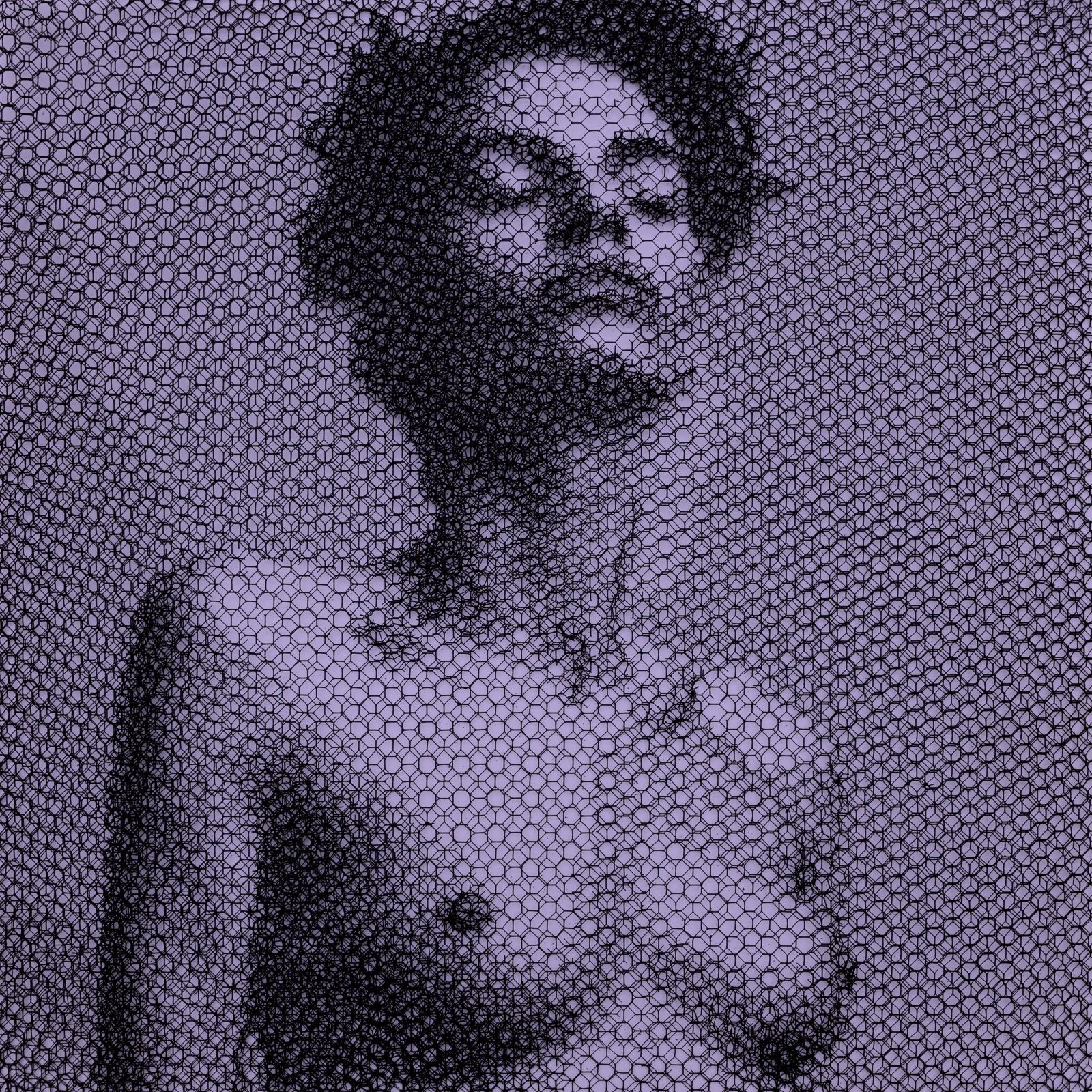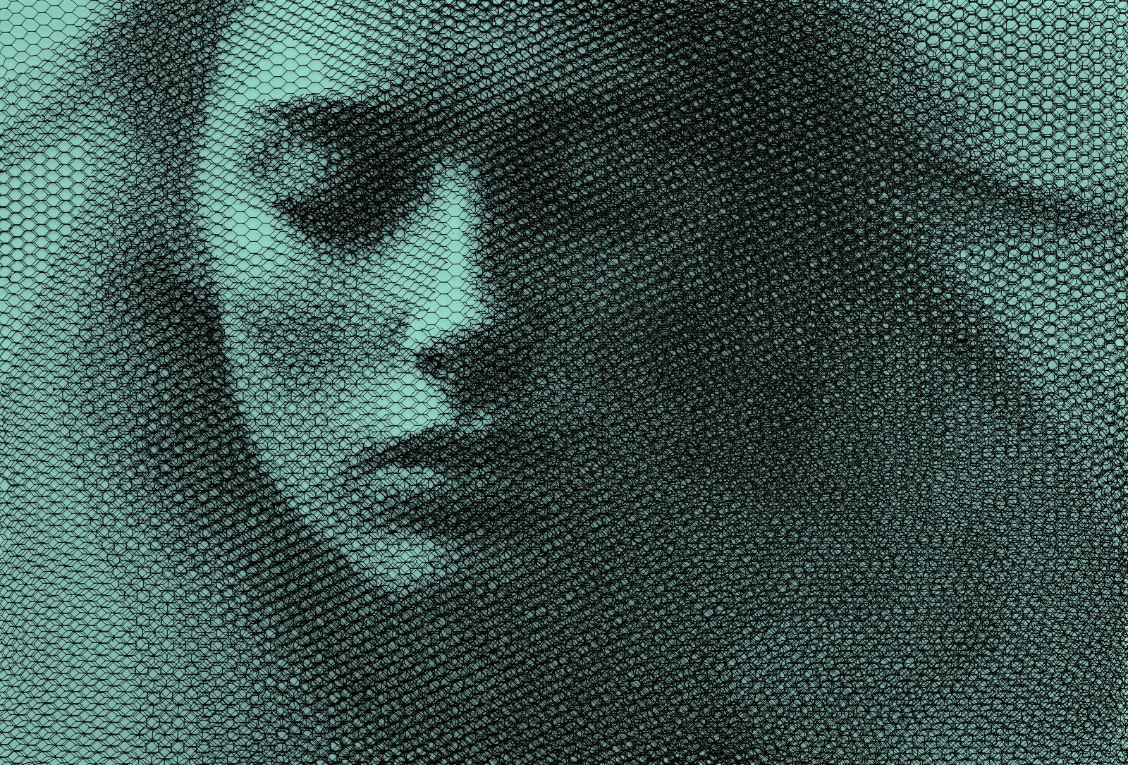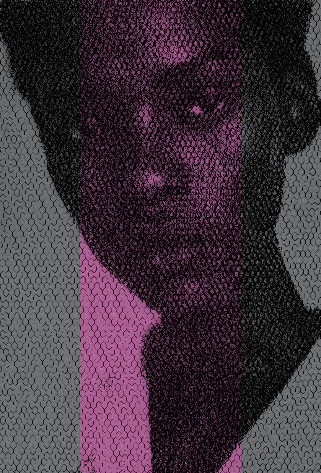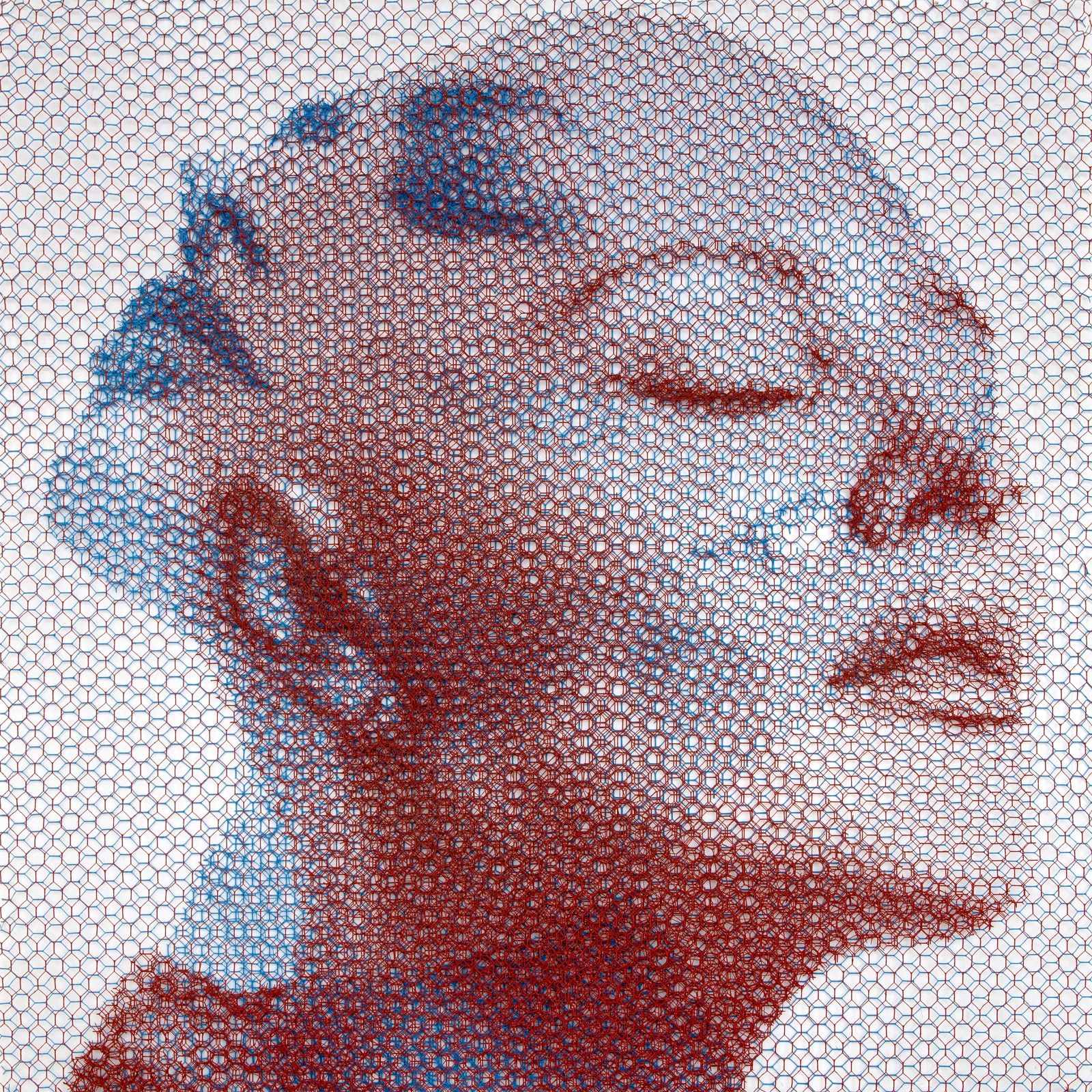 Without any drawing on the monochrome backdrop, from the studied superimposition of 10 layers of wire mesh, patiently cut by hand in studied locations, appear the chiaroscuro gradations that make up the images of young women’s faces, mannequins, details of classical statuary, or even interiors of buildings and urban views.